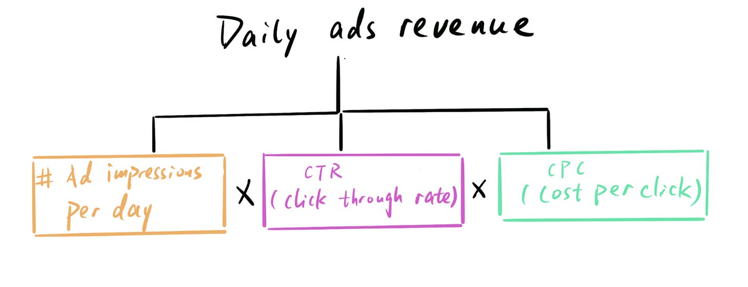 Let’s also assume ads revenue is click-based (i.e. advertisers are charged, and you make money, per click). We can then decompose this mathematically: