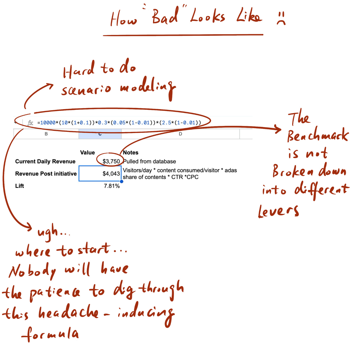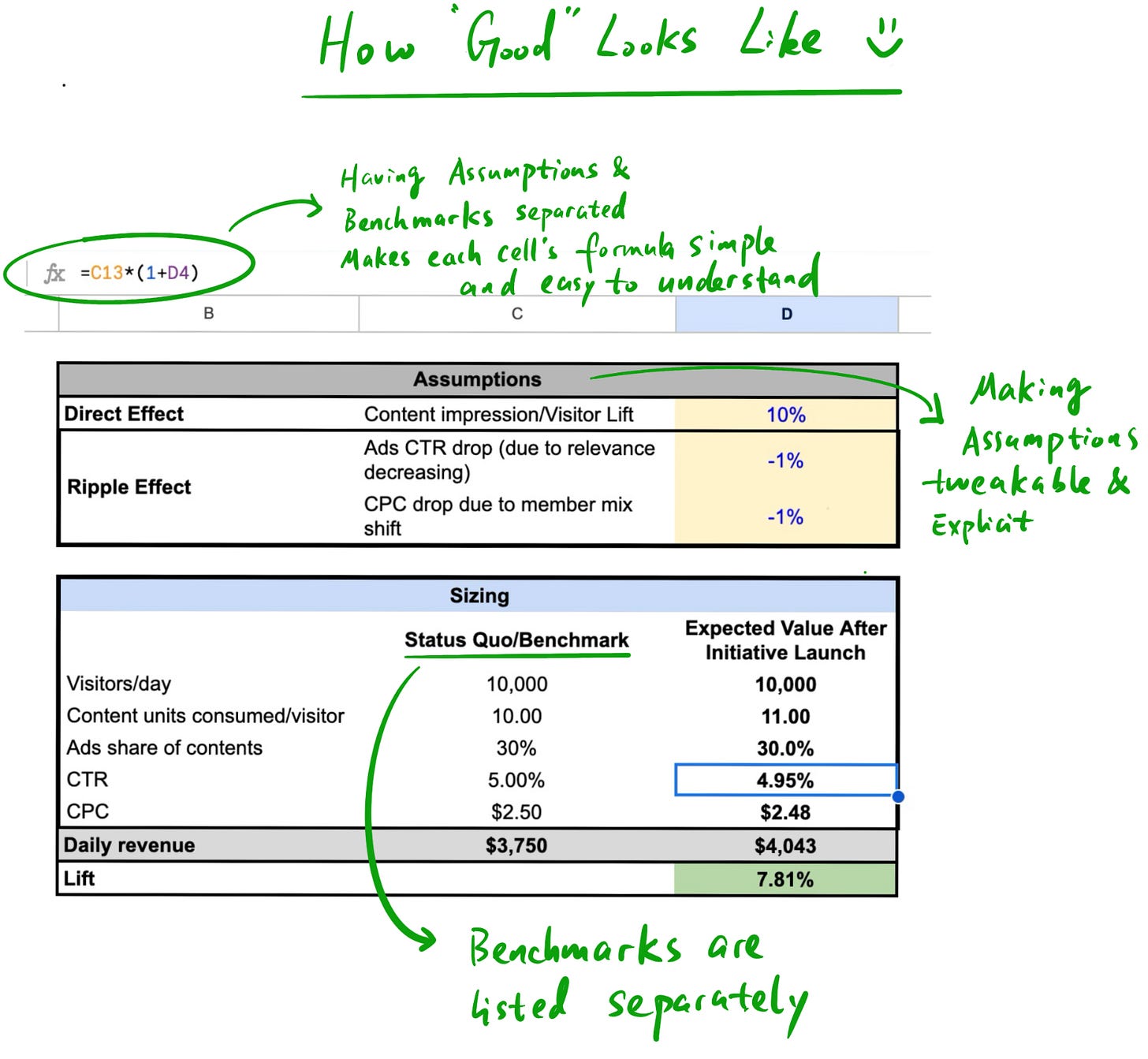 One tip for enabling this scalability is to separate the structure of the calculation from the assumptions. In other words, list out the relevant variables from your driver tree and link them, and then have a separate section where you list out all of your assumptions like the expected lift from your initiative (instead of hardcoding them into the formulas).
