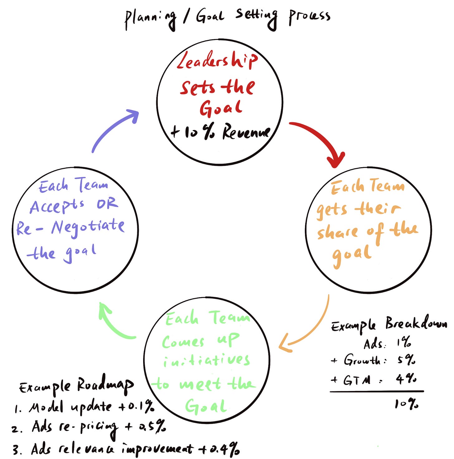 Leadership decides on top-down goals for the company (e.g. grow revenue by $XM)