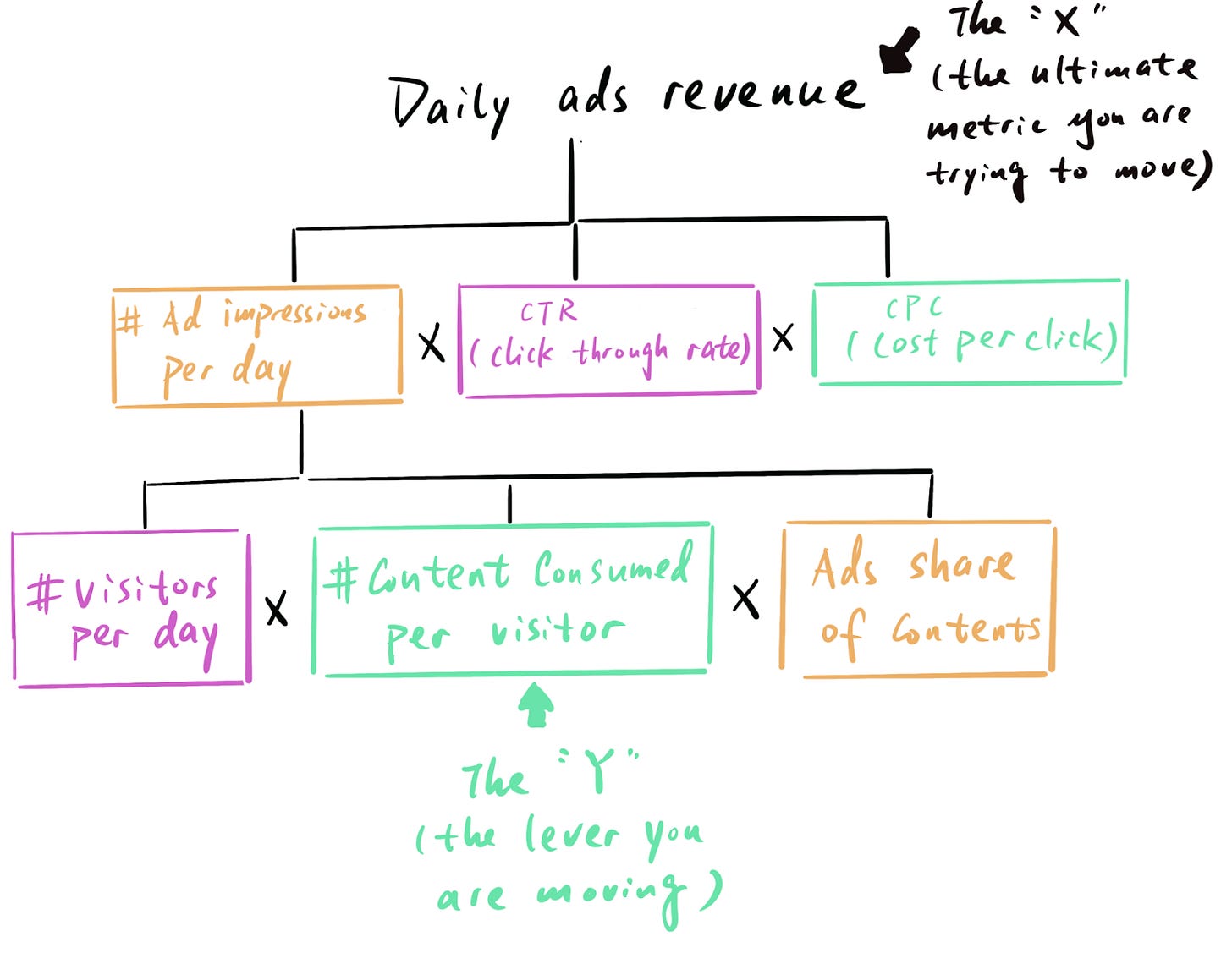 You need to keep on building out the tree (by breaking down the components into more granular subcomponents like shown above) until the metric you plan to move through your initiative (Y) shows up as a branch in the tree; then you can figure out the quantitative relationship by tracing the path all the way up to your target metric X.